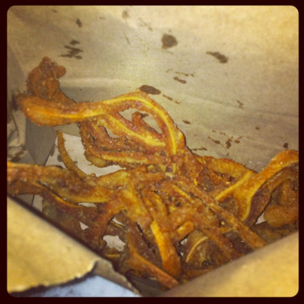 Served in a brown paper bag you are told to rip it open and dig in.. ignore the odd pig hair..they add to the flavour.